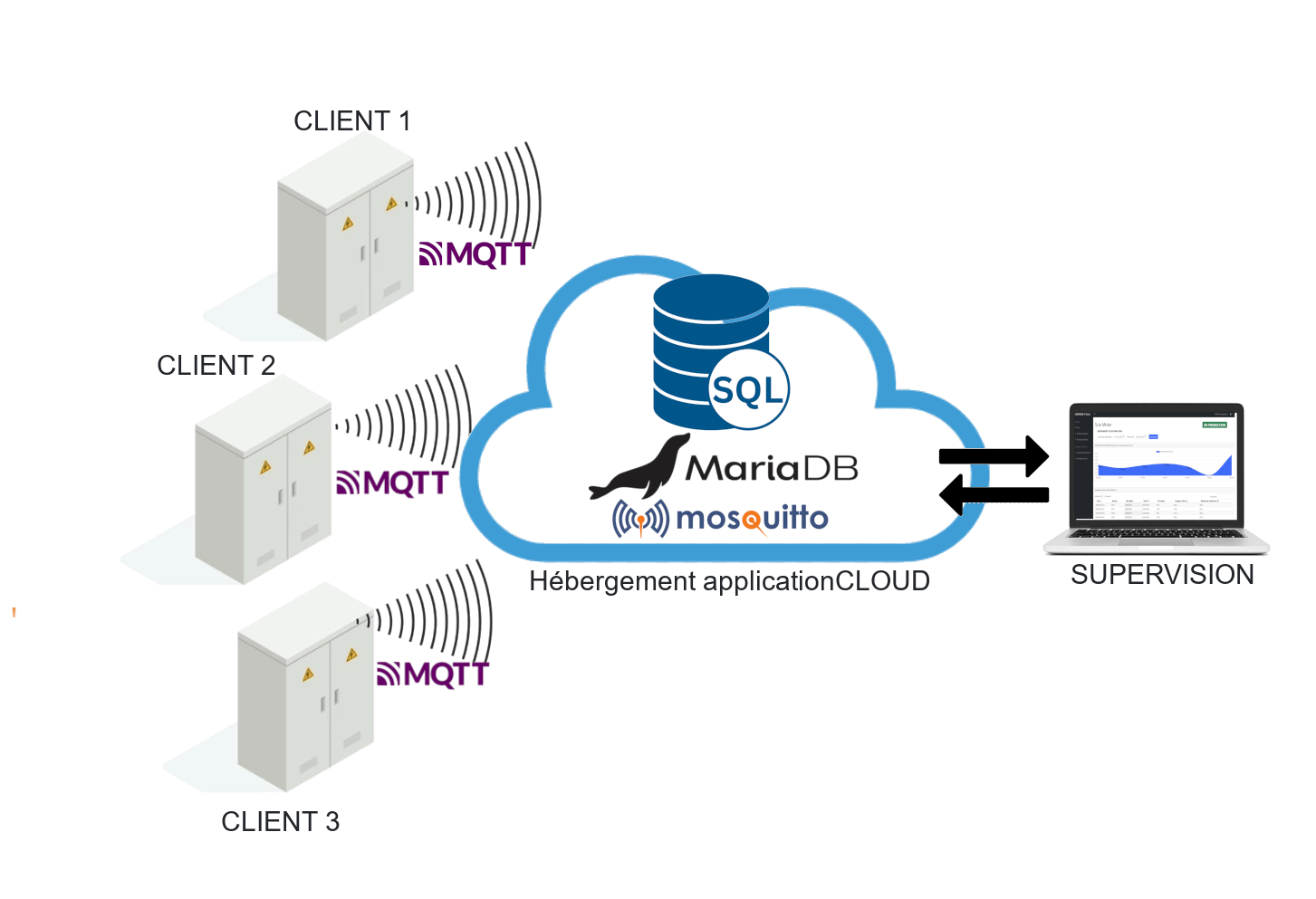 Système basé sur des échanges MQTT entre automate process du client et une base de donnée hébergée dans le cloud.